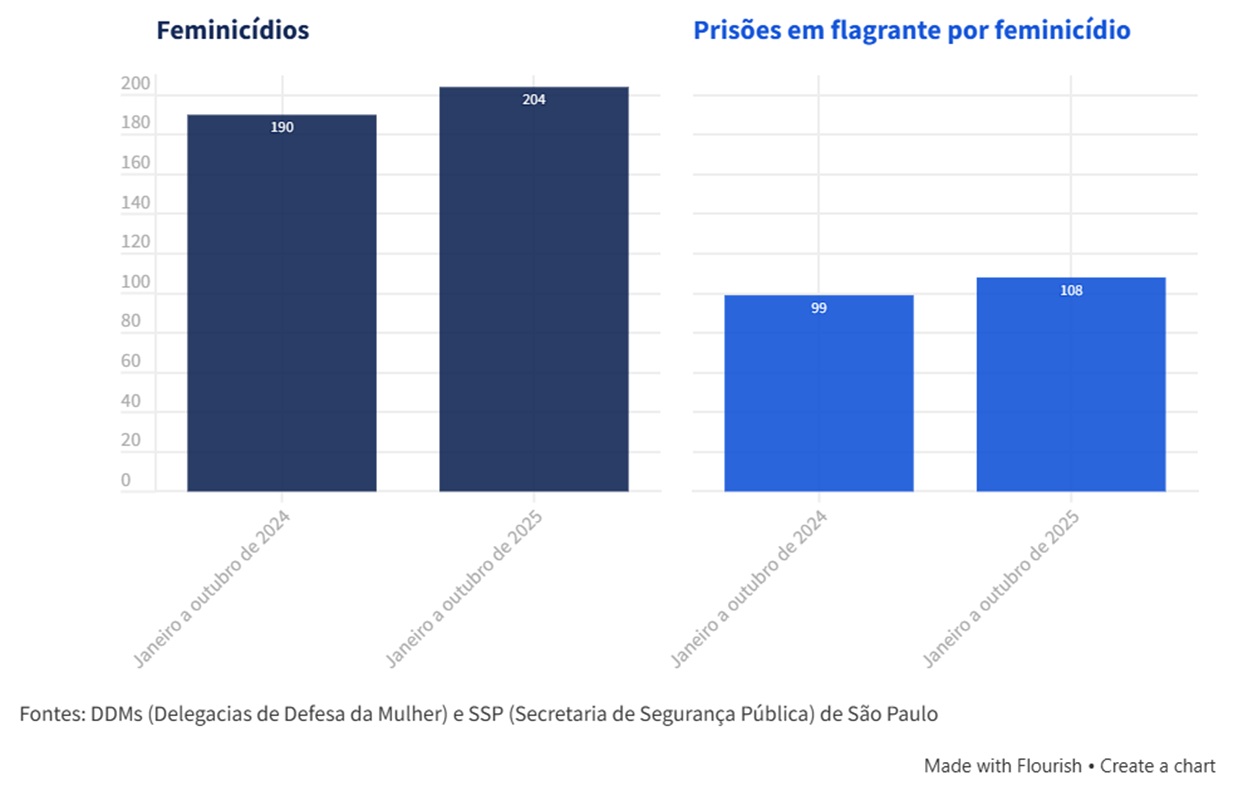 As prisões em flagrante associadas aos feminicídios também cresceram, mas em ritmo menor. Foram 108 detenções entre janeiro e outubro, contra 99 no mesmo período de 2024 — alta de 9%.