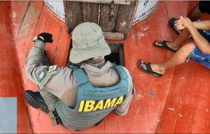Agente do Ibama verifica depósito de combustível em um barco no rio Solimões (Imagem: Divulgação/Ibama)
