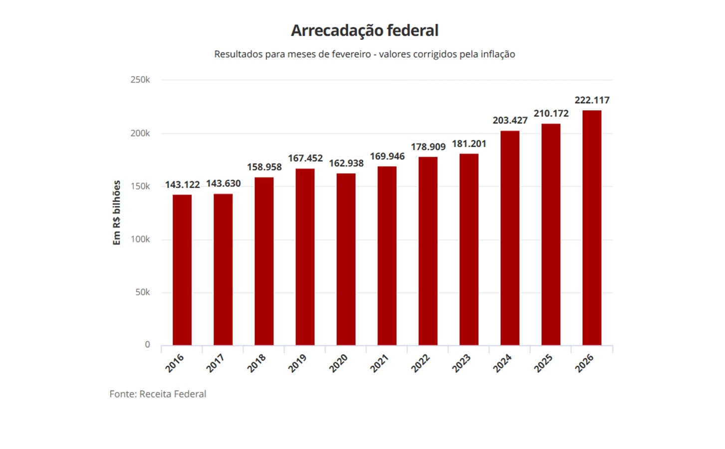 O valor também foi o maior já registrada para meses de fevereiro desde o início da série histórica da Receita Federal em 1995 — ou seja, em 32 anos.