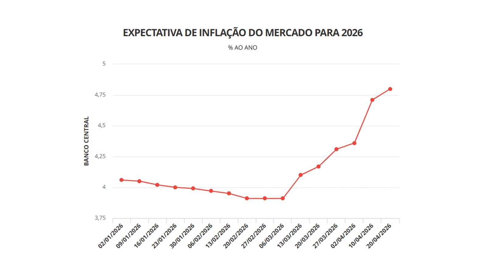 De acordo com a pesquisa do BC, o mercado passou a projetar que a inflação oficial, medida pelo Índice Nacional de Preços ao Consumidor Amplo (IPCA), em 4,80% neste ano, contra a projeção anterior de 4,71%.