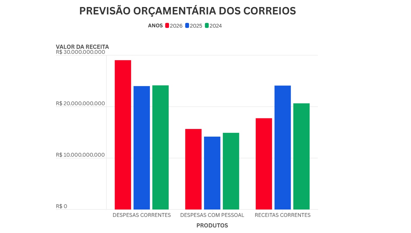 A previsão orçamentária dos Correios para 2026, publicada no "Diário Oficial da União" desta terça-feira (30), apresenta previsão de aumento de 21% nas despesas correntes da empresa e redução de 26% nas receitas.