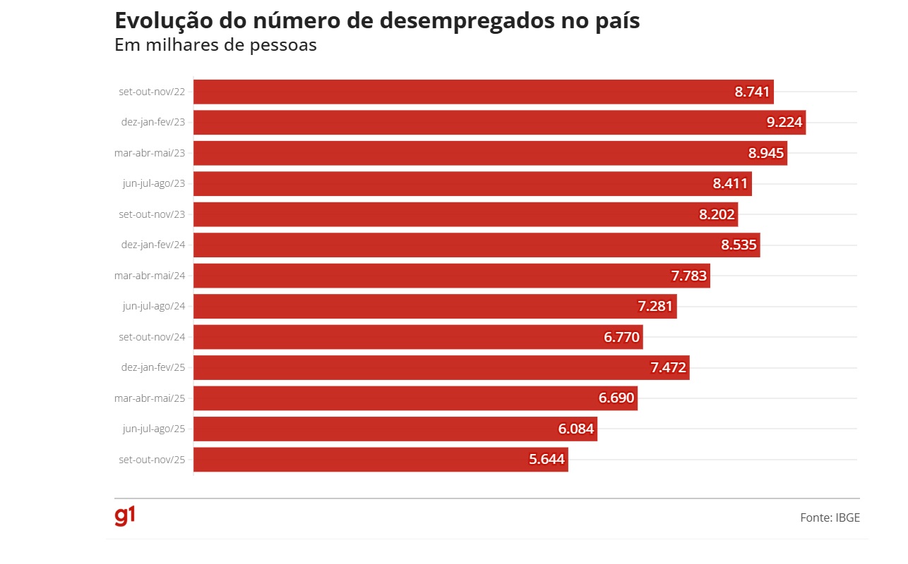 A taxa de desemprego no Brasil foi de 5,2% no trimestre móvel encerrado em novembro, segundo a Pesquisa Nacional por Amostra de Domicílios Contínua (Pnad Contínua), divulgada nesta terça-feira (30) pelo Instituto Brasileiro de Geografia e Estatística (IBGE).