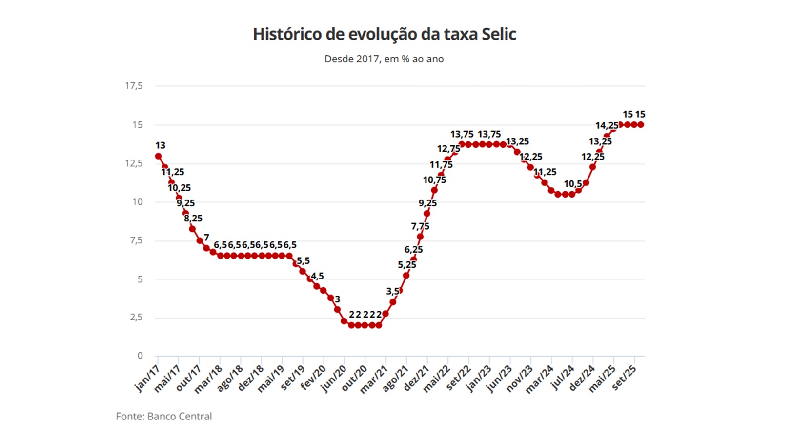 O Comitê de Política Monetária (Copom) do Banco Central do Brasil se reúne nesta quarta-feira (10) e deve manter a taxa básica de juros da economia inalterada em 15% ao ano — o maior patamar em quase 20 anos.