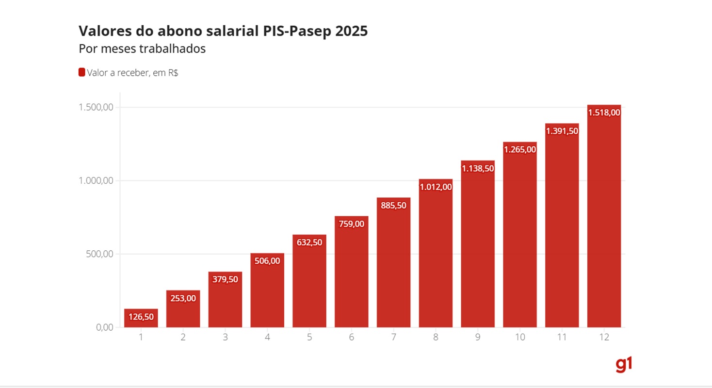 O valor do abono salarial varia de R$ 126,50 a R$ 1.518,00, de acordo com a quantidade de meses trabalhados. Veja no gráfico abaixo: