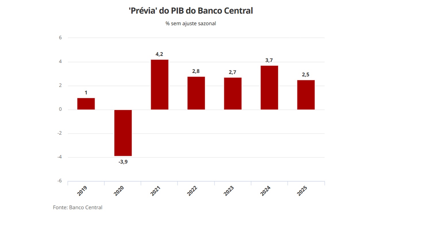 O Índice de Atividade Econômica (IBC-BR) do Banco Central, considerado a "prévia" do Produto Interno Bruto (PIB), registrou expansão de 2,5% em 2025 na comparação com o ano anterior, informou a instituição nesta quinta-feira (19).