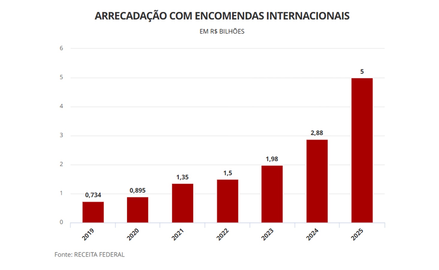 O governo arrecadou o valor recorde de R$ 5 bilhões em imposto de importação em 2025 com as encomendas internacionais, de acordo com informações da Secretaria da Receita Federal.
