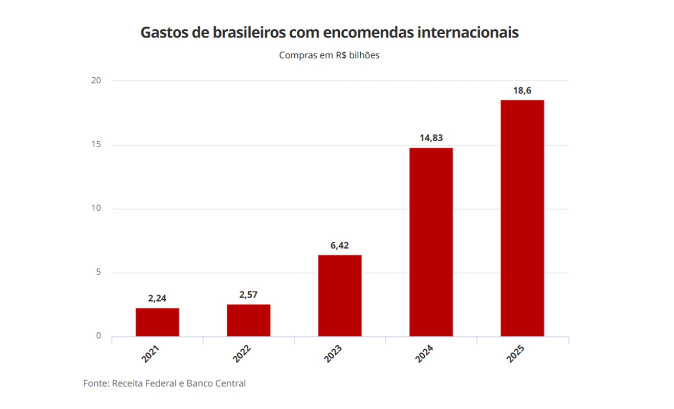 ➡️Os gastos totais com encomendas internacionais, por sua vez, subiram para R$ 18,6 bilhões (novo recorde) no último ano, contra R$ 15 bilhões em 2024.
