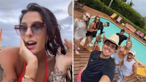 É que ela desembarcou de jatinho em Balneário Camboriú (SC). Em uma mansão à beira da praia, ela surgiu fazendo farra com seu grupo de amigos.