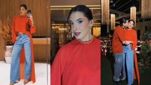 Para a ocasião, a sertaneja apostou em uma bata vermelha combinada com calça jeans e scarpin bege, além de acessórios em dourado, que completaram a produção.