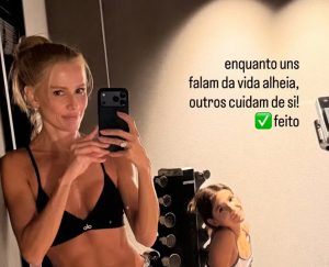 Na imagem, a atriz aparece de top e short, fazendo uma selfie em frente ao espelho. Na foto, Deborah deixou um recado que foi interpretado como uma indireta às críticas recentes: