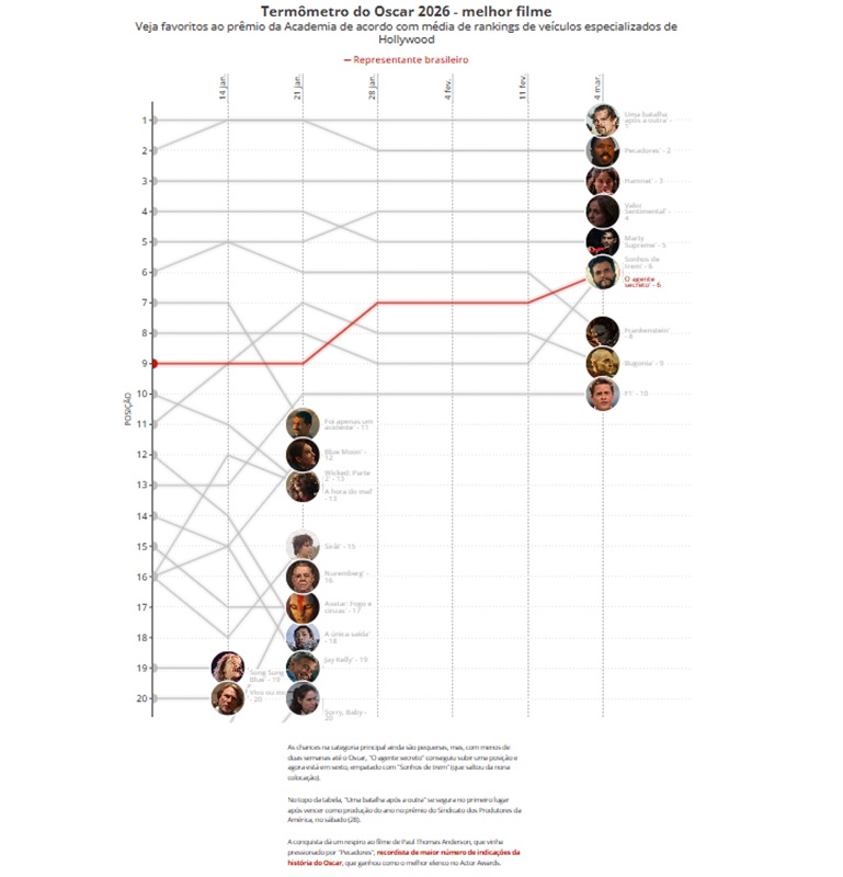 As chances na categoria principal ainda são pequenas, mas, com menos de duas semanas até o Oscar, "O agente secreto" conseguiu subir uma posição e agora está em sexto, empatado com "Sonhos de trem" (que saltou da nona colocação).