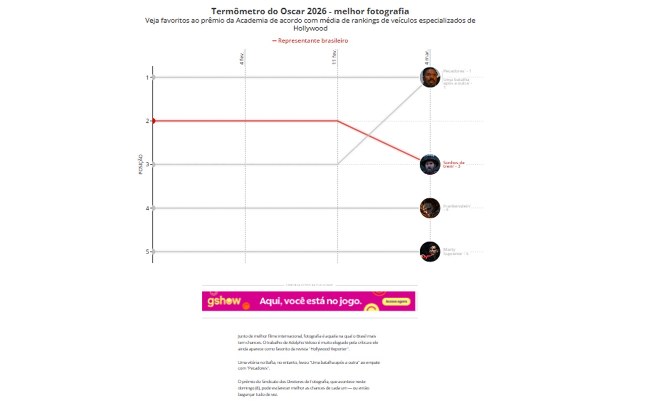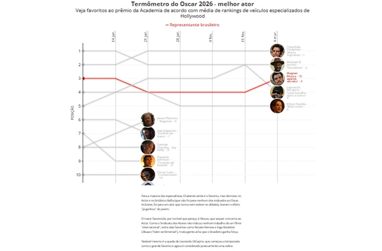 Veja nos gráficos abaixo as chances que os representantes brasileiros (o filme "O agente secreto", o ator Wagner Moura e o diretor de fotografia Adolpho Veloso, de "Sonhos de trem") têm nas cinco categorias em que foram indicados, de acordo com uma média entre as previsões de cinco veículos especializados em premiações — e como elas variaram desde o começo de 2026.