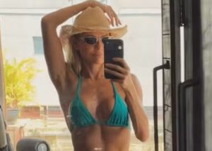 Em um vídeo compartilhado nos Stories, a atriz posa em frente ao espelho de biquíni azul, óculos escuros e chapéu.