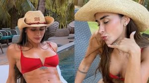 Para aproveitar a piscina do hotel paradisíaco, a influenciadora investiu em um biquíni vermelho e um chapéu grifado da Miu Miu.