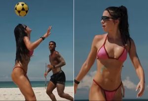 A influenciadora, atriz e ex-BBB Jade Picon, de 24 anos de idade, voltou a arrasar em mais um dia de praia e, de biquíni fio-dental, postou em seu Instagram, nessa quarta-feira (15), um vídeo em que aparece mostrando todo seu talento ao praticar o esporte com amigos nas areias do Rio de Janeiro.