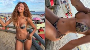 Nesta sexta-feira (3), ela posou na praia com um biquíni estampado e deixou os fãs impressionados com sua beleza.
