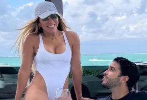 Ex-mulher de Hulk, a influenciadora Iran Ângelo, de 55 anos de idade, curtiu o sábado (7) em clima de romance com o noivo, Lucas Suassuna, de 39 anos. De maiô branco cavadíssimo e com direito a taças de vinhos diante da paisagem litorânea, os dois curtiram um banho na banheira de hidromassagem e trocaram beijos.