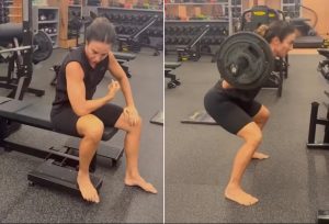 De short colado e camiseta pretos, Veveta encarou exercícios de musculação e funcional, com direito a levantamento de peso e agachamentos, incluindo o agachamento búlgaro. A musa do axé ainda tirou onda ao puxar a manga da camiseta e mostrar o muque, com o braço torneado.