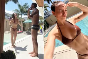 "O karaokê reinando em toda folga!", escreveu Larissa ao mostrar o casal cantando. "Domingo recarregando as energias pra semana q vai começar", ainda escreveu ela com uma selfie de biquíni marrom à beira da piscina.