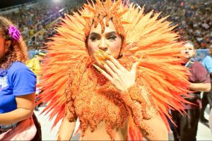 A fantasia faz jus ao posto de realeza: Mileide usou um costeiro giratório, cheio de penas em tons de laranja.