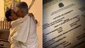 Glória, de 91 anos, não compareceu à cerimônia, mas desejou felicidades aos pombinhos por videochamada. Os cachorros da família foram vestidos de gala. Mocita, de 60, já havia contado que tinha sido pedida em casamento pelo companheiro, de 61. Ela adiantou que a cerimônia seria discreta e simples.