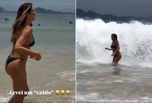 Porém, nem tudo saiu como esperado, já que Tici foi surpreendida por uma onda forte e alta, e 'levou um caldo' daqueles! Em seguida, ela postou o vídeo 'oficial', em que consegue finalizar o mergulho em águas cariocas.
