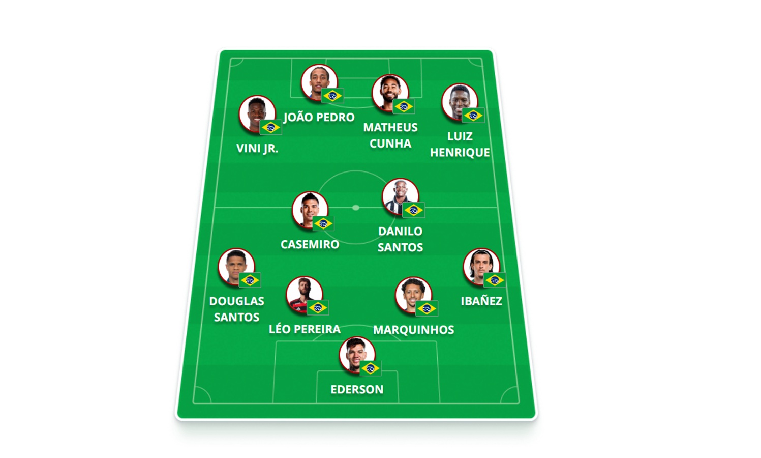 Provável escalação: Ederson, Ibañez, Marquinhos, Léo Pereira e Douglas Santos; Casemiro e Danilo; Luiz Henrique, Matheus Cunha, João Pedro e Vini Jr.