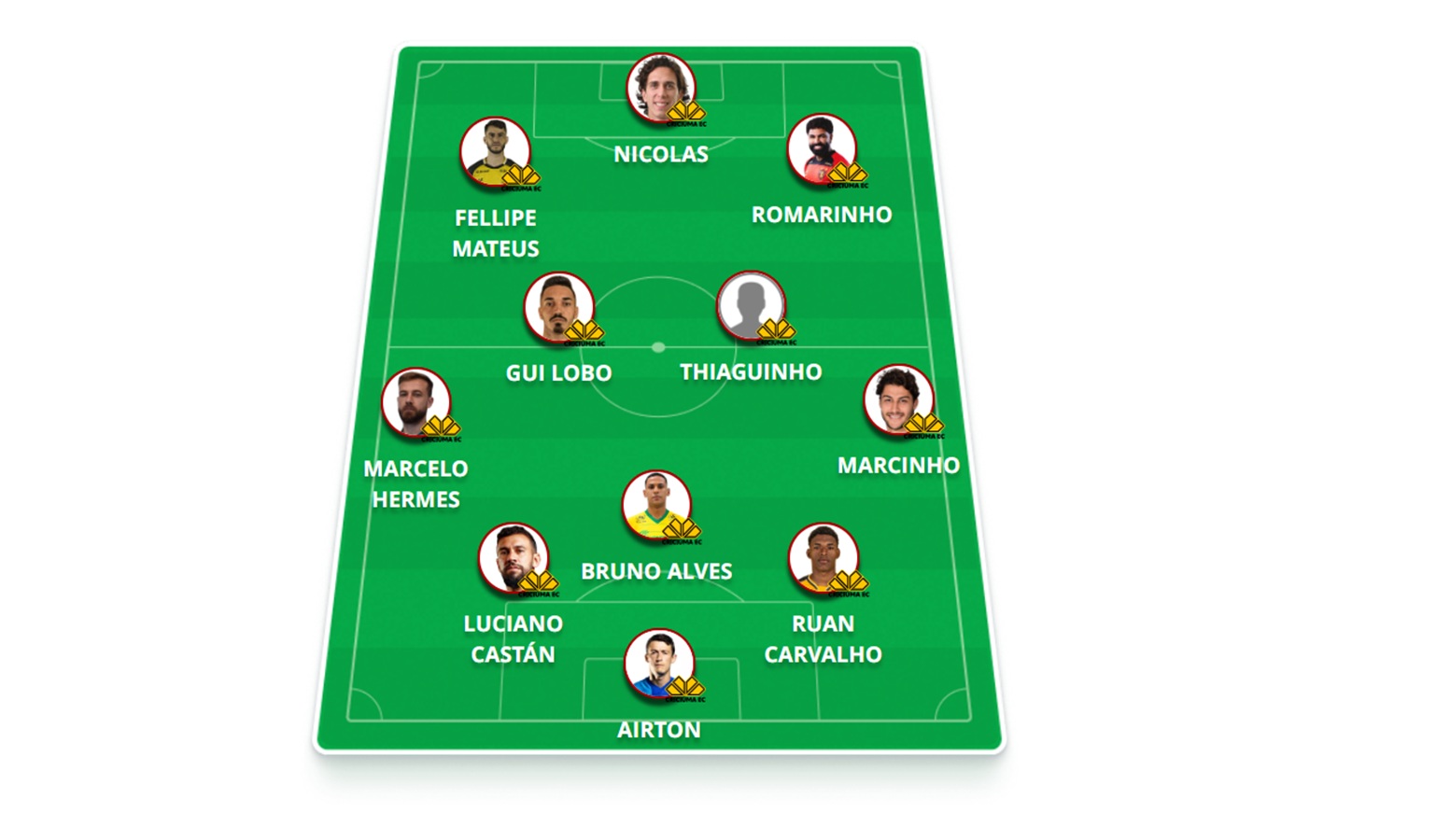 Provável escalação: Airton; Ruan, Bruno Alves (Hiago) e Luciano Castán; Marcinho, Gui Lobo, Thiaguinho e Marcelo Hermes; Romarinho, Nicolas e Fellipe Mateus.