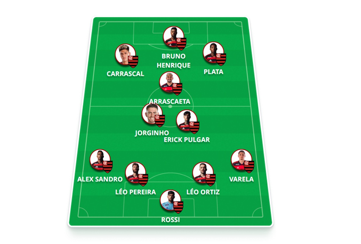 Provável escalação do Flamengo: Rossi; Varela, Léo Ortiz (Danilo), Léo Pereira e Alex Sandro; Pulgar, Jorginho e Arrascaeta; Carrascal, Plata (Cebolinha) e Bruno Henrique.