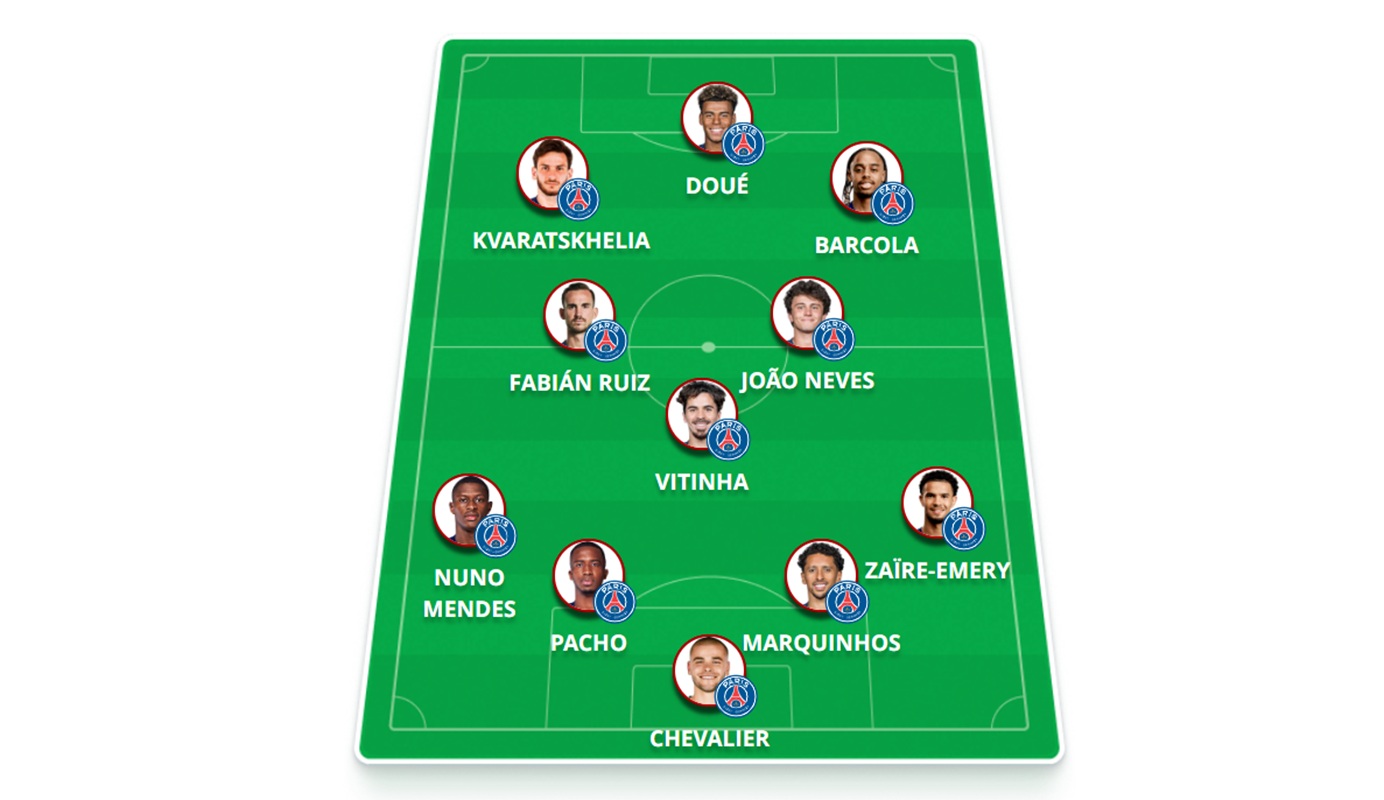 Provável escalação do PSG: Chevalier; Zaïre-Emery, Marquinhos, Pacho e Nuno Mendes; Vitinha, João Neves e Fabián Ruíz; Kvaratskhelia, Doué e Barcola.