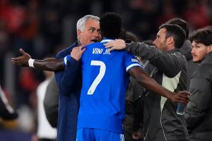 Mourinho conversa com Vini Jr. após o gol do Real Madrid — Foto: Angel Martinez/Getty Images