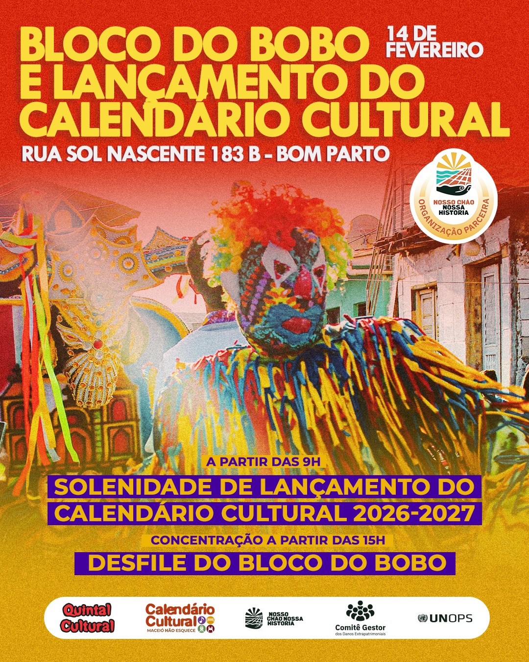Data: 14 de fevereiro (sábado) 09h - Solenidade de Lançamento do Calendário Cultural Maceió Não Esquece 15h - Desfile do Bloco do Bobo Local: Sede do Quintal Cultural – Rua Sol Nascente, 183-B, Bom Parto Aberto ao público