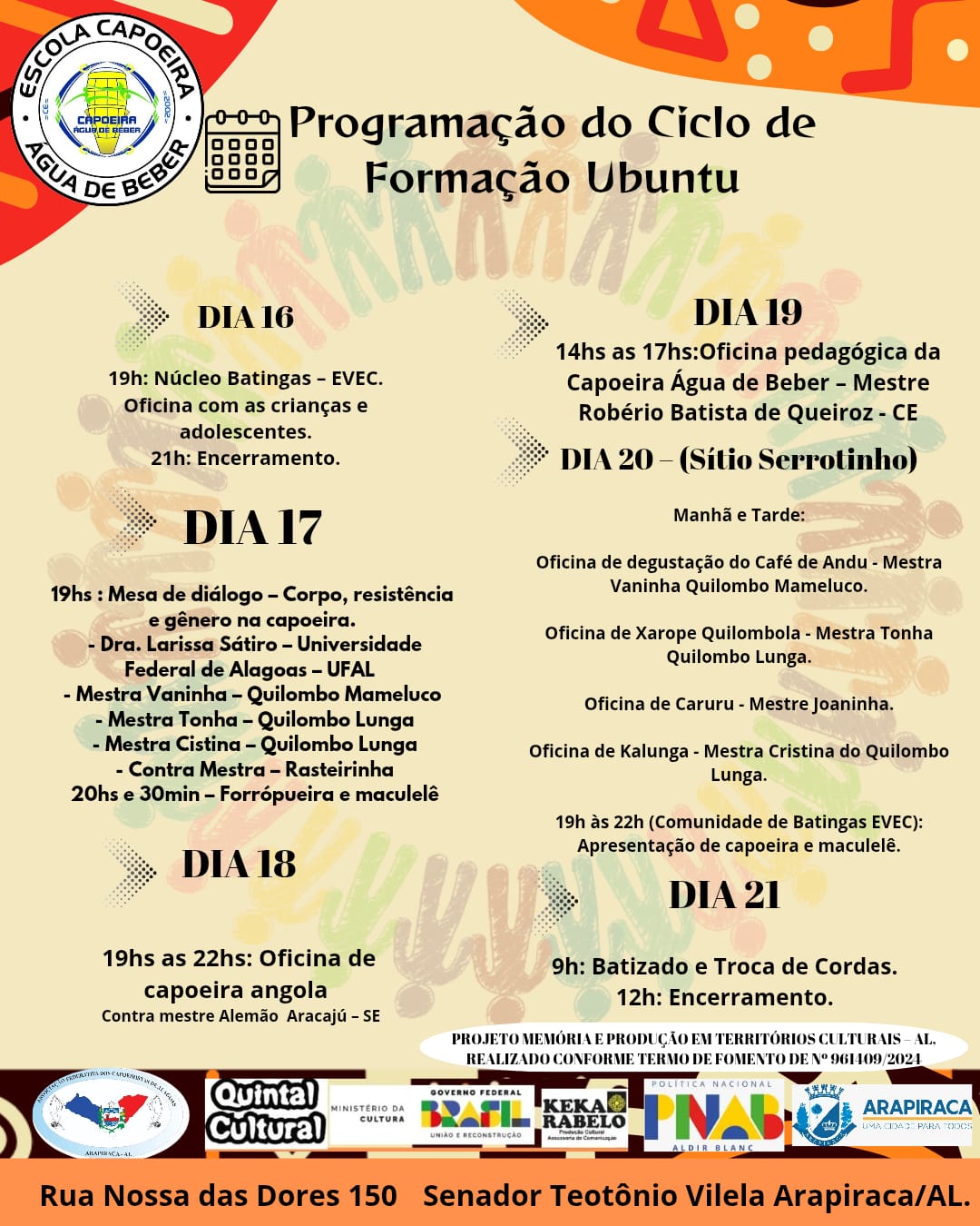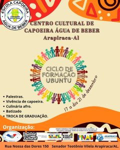 SERVIÇO Ciclo de Formação Ubuntu Data : 16 a 21 de dezembro Local: Centro Cultural de Capoeira Água de Beber - Rua Nossa das Dores, 150, Senador Teotônio Vilela, Arapiraca/AL Mais Informações e Assessoria de Imprensa: 82 98220 3194 / 99968-1560/ @cecab.arapiraca