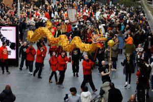 Artista posa para foto durante procissão do Ano Novo Chinês no Reino Unido, em foto de 14 de fevereiro de 2026 — Foto: Reuters/Temilade Adelaja