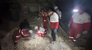 Imagens divulgadas pela Sociedade do Crescente Vermelho Iraniano mostram equipes de resgate vasculhando os escombros dos prédios atingidos.