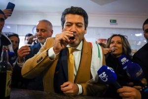 Candidato pelo Chega, da extrema direita, André Ventura bebe vinho durante campanha presidencial, em 9 de janeiro de 2026. (Imagem: Pedro Nunes/ Reuters)