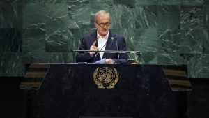 Presidente do Irã, Masoud Pezeshkian, discursa à Assembleia Geral da ONU, em Nova York (Imagem: REUTERS/Jeenah Moon)