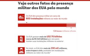 - São cerca de 170 mil tropas postadas em cerca de 800 instalações militares em dezenas de países com os quais os EUA têm parceria.