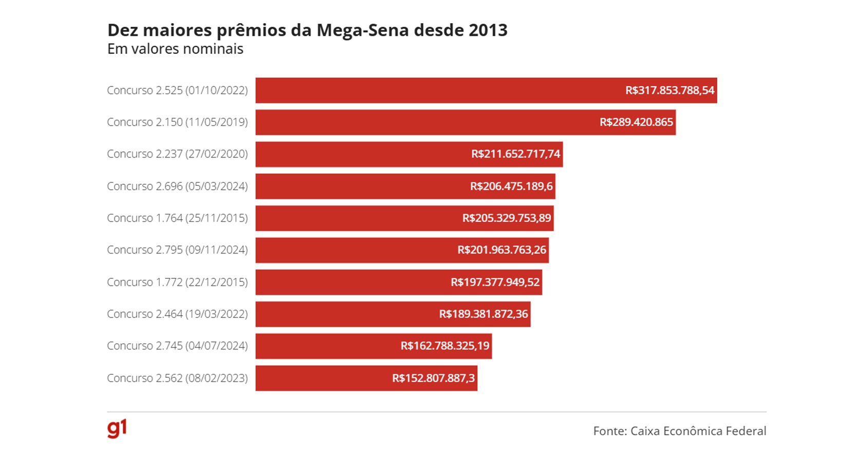 Já para uma aposta com 20 dezenas (limite máximo), com o preço de R$ 232.560,00, a probabilidade de acertar o prêmio é de 1 em 1.292, ainda de acordo com a instituição.