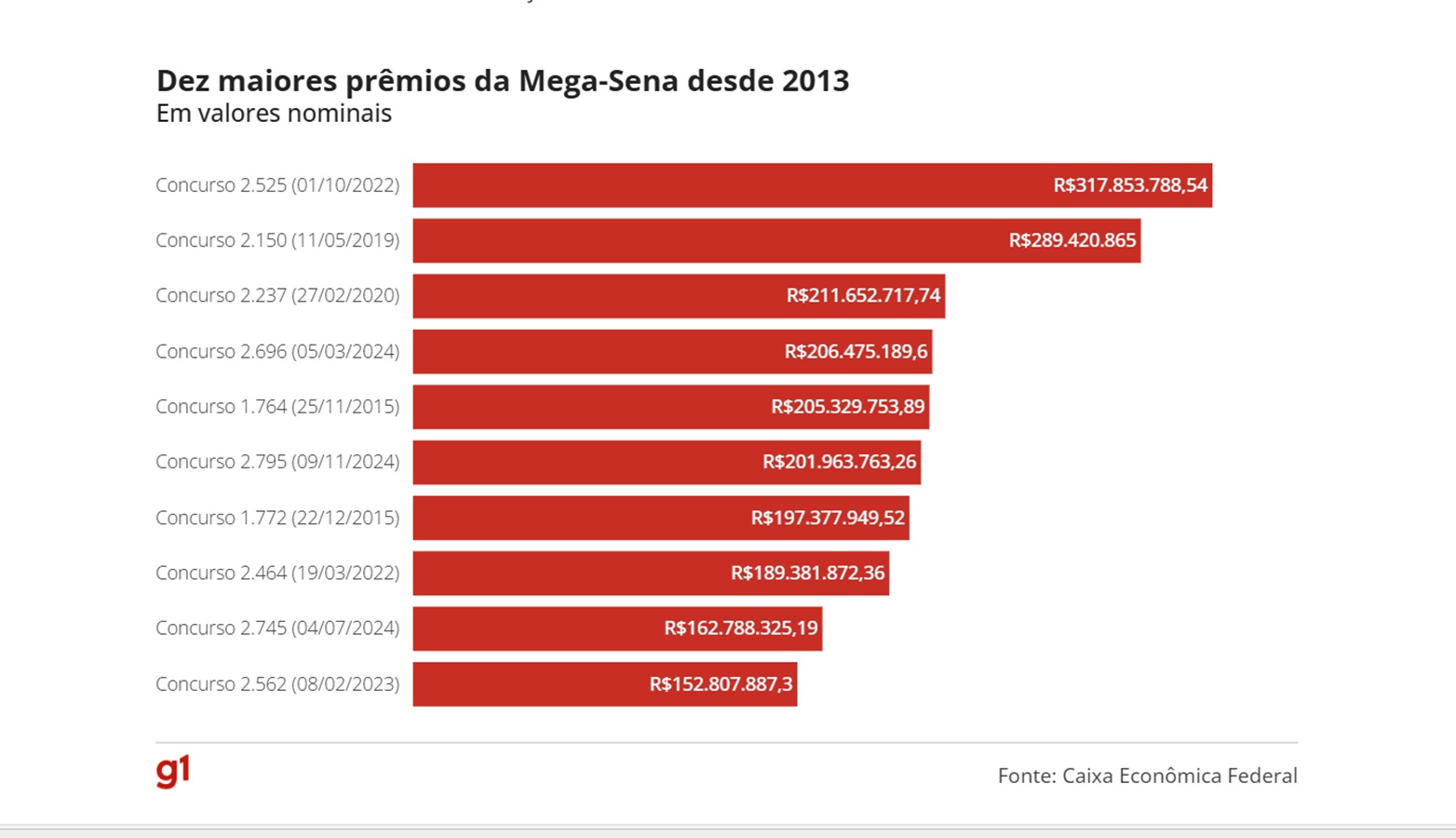 Já para uma aposta com 20 dezenas (limite máximo), com o preço de R$ 232.560,00, a probabilidade de acertar o prêmio é de 1 em 1.292, ainda de acordo com a instituição.