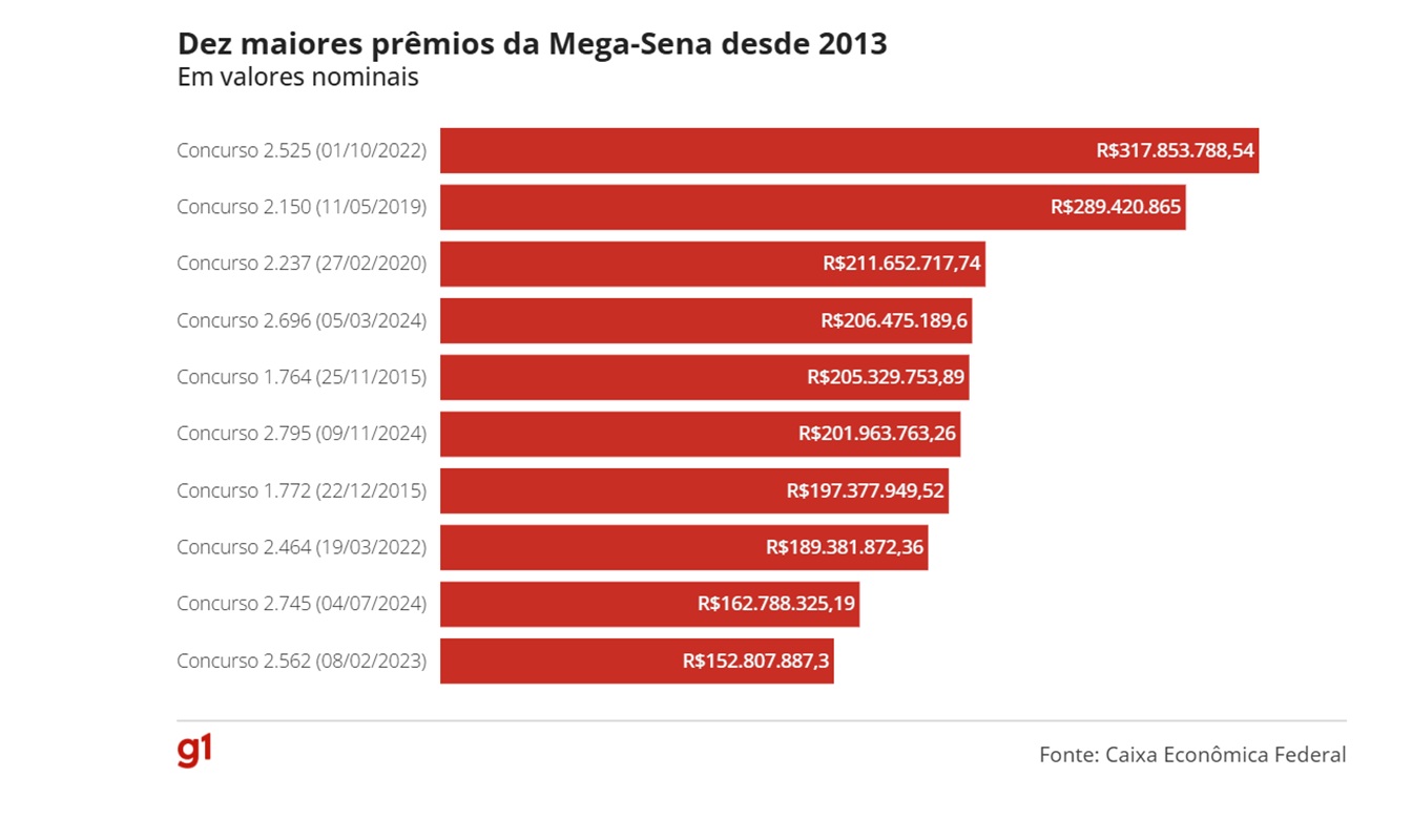 Já para uma aposta com 20 dezenas (limite máximo), com o preço de R$ 232.560,00, a probabilidade de acertar o prêmio é de 1 em 1.292, ainda de acordo com a instituição.