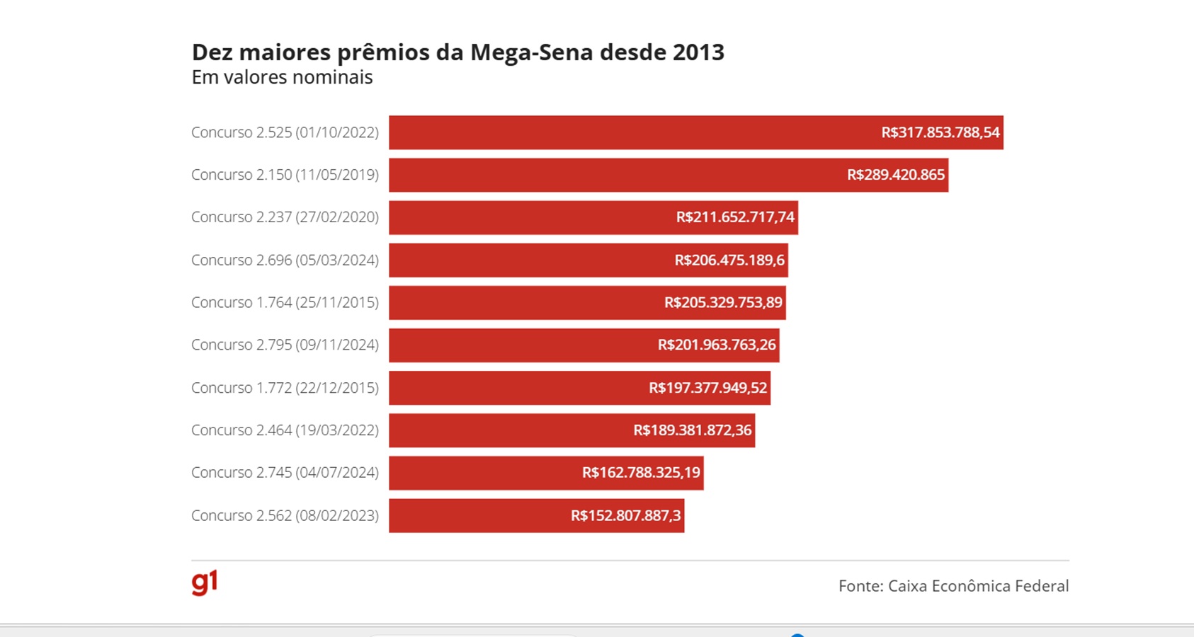 Já para uma aposta com 20 dezenas (limite máximo), com o preço de R$ 232.560,00, a probabilidade de acertar o prêmio é de 1 em 1.292, ainda de acordo com a instituição.