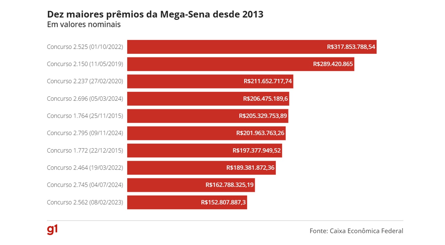 Já para uma aposta com 20 dezenas (limite máximo), com o preço de R$ 232.560,00, a probabilidade de acertar o prêmio é de 1 em 1.292, ainda de acordo com a instituição.