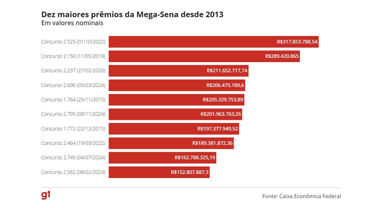 Já para uma aposta com 20 dezenas (limite máximo), com o preço de R$ 232.560,00, a probabilidade de acertar o prêmio é de 1 em 1.292, ainda de acordo com a instituição.
