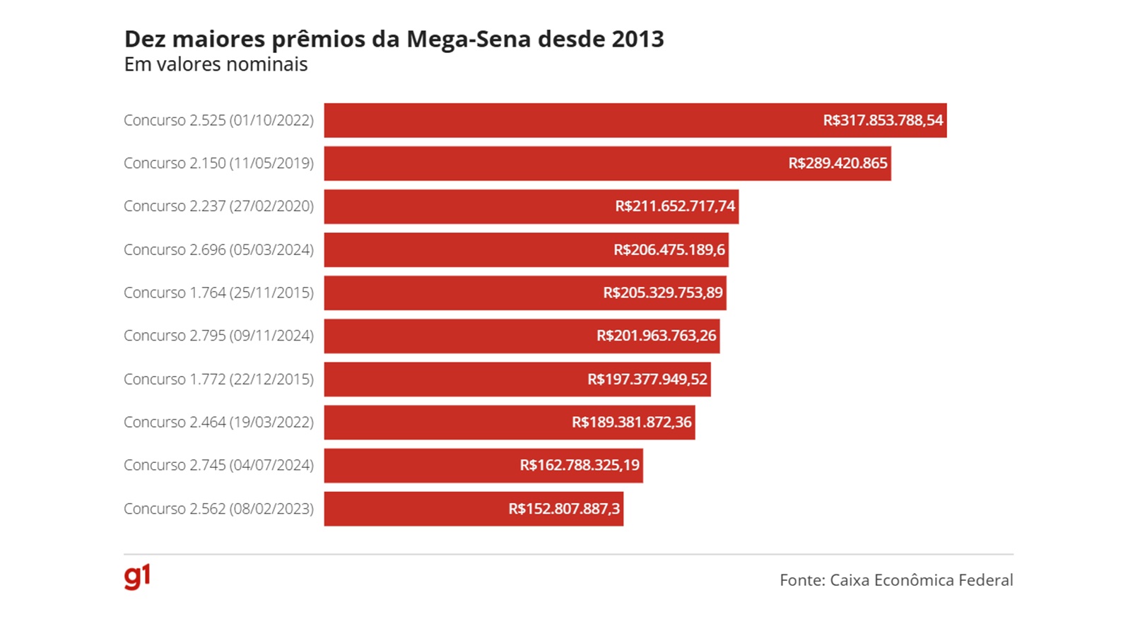 Já para uma aposta com 20 dezenas (limite máximo), com o preço de R$ 232.560,00, a probabilidade de acertar o prêmio é de 1 em 1.292, ainda de acordo com a instituição.