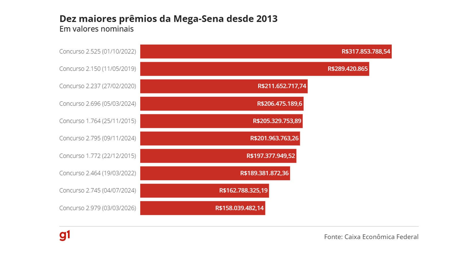 Já para uma aposta com 20 dezenas (limite máximo), com o preço de R$ 232.560,00, a probabilidade de acertar o prêmio é de 1 em 1.292, ainda de acordo com a instituição.