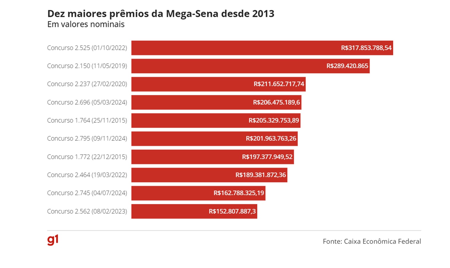 Já para uma aposta com 20 dezenas (limite máximo), com o preço de R$ 232.560,00, a probabilidade de acertar o prêmio é de 1 em 1.292, ainda de acordo com a instituição.