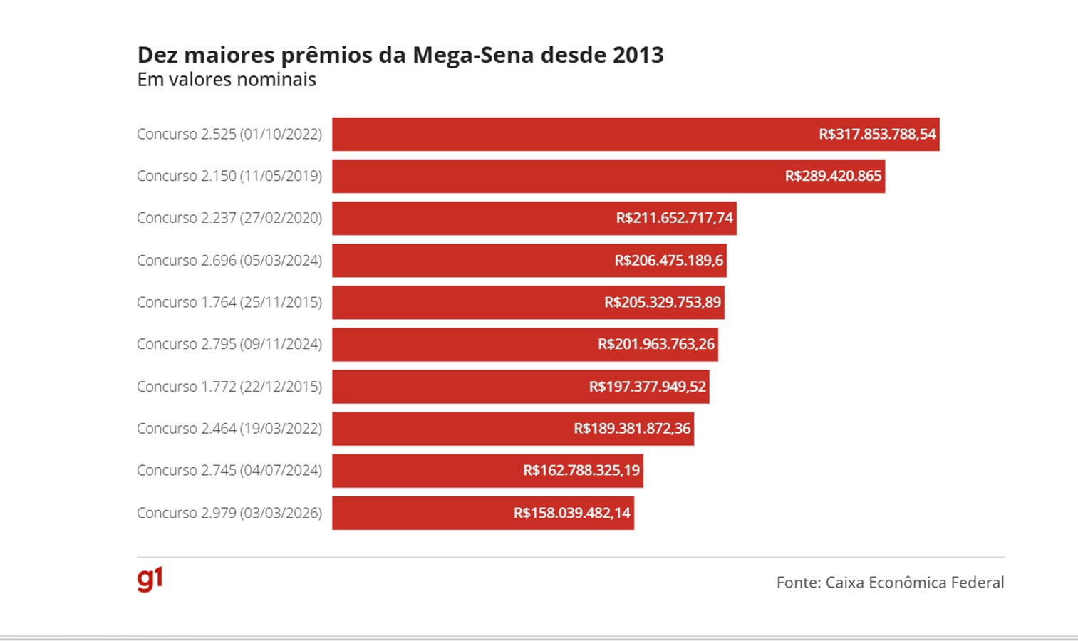 Já para uma aposta com 20 dezenas (limite máximo), com o preço de R$ 232.560,00, a probabilidade de acertar o prêmio é de 1 em 1.292, ainda de acordo com a instituição.