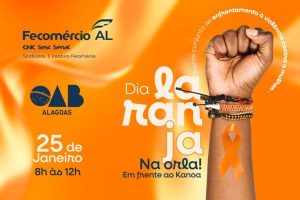 Neste domingo, dia 25, o Sistema Fecomércio-Sesc-Senac Alagoas promoverá o Dia Laranja, na orla de Maceió. A ação, realizada em parceria com a Ordem dos Advogados do Brasil – seccional Alagoas (OAB AL), por meio da Comissão Especial da Mulher (CEM), busca conscientizar a população sobre a necessidade de somar forças no combate à violência contra mulheres e meninas e acontecerá das 8h às 12h, no estacionamento em frente ao restaurante Kanoa.