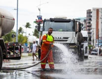 O trabalho tem o apoio de quatro caminhões-pipa, responsáveis pela lavagem das ruas, além de três caminhões coletores que seguem encaminhando os resíduos ao aterro sanitário. Mais de 100 papeleiras e lixeiras foram disponibilizadas ao longo da orla para incentivar o descarte correto do lixo pela população.